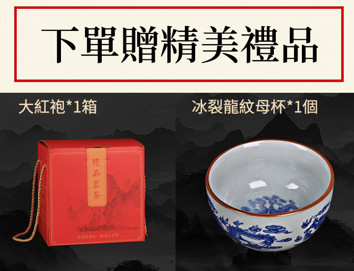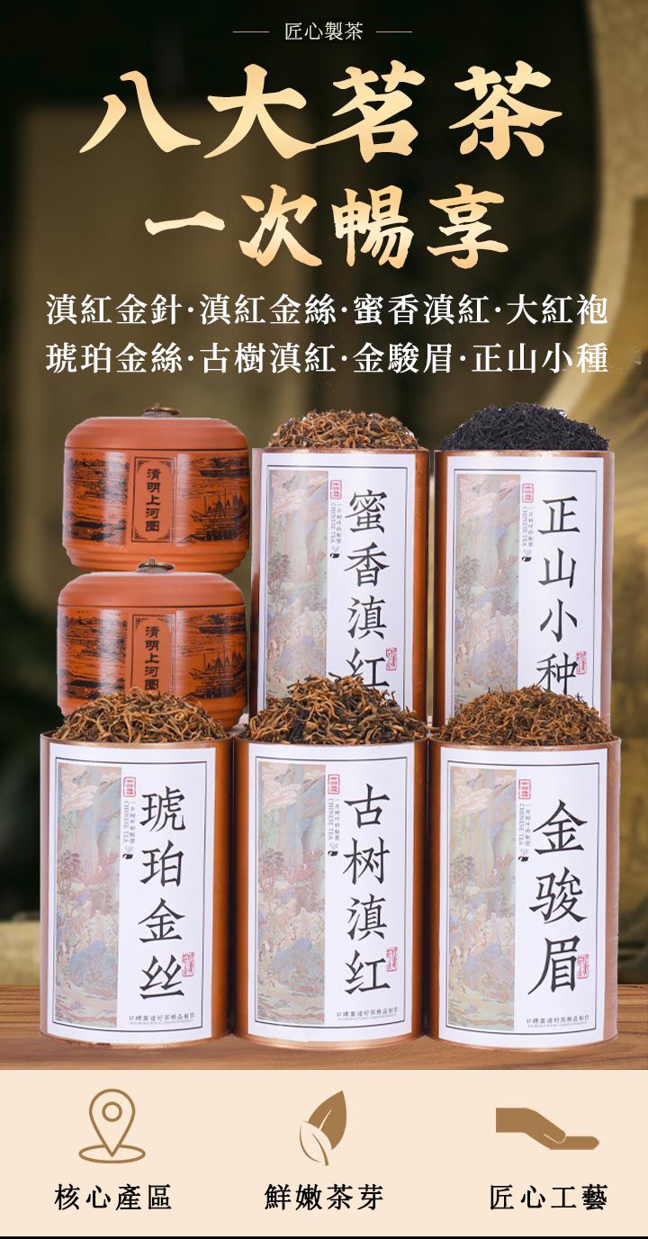 五桶(蜜香滇紅+正山小種+琥珀金絲+古樹滇紅+金駿眉)+兩罐(滇紅金針+滇紅金絲)+贈一箱大红袍、茶具(冰裂龍紋母杯)